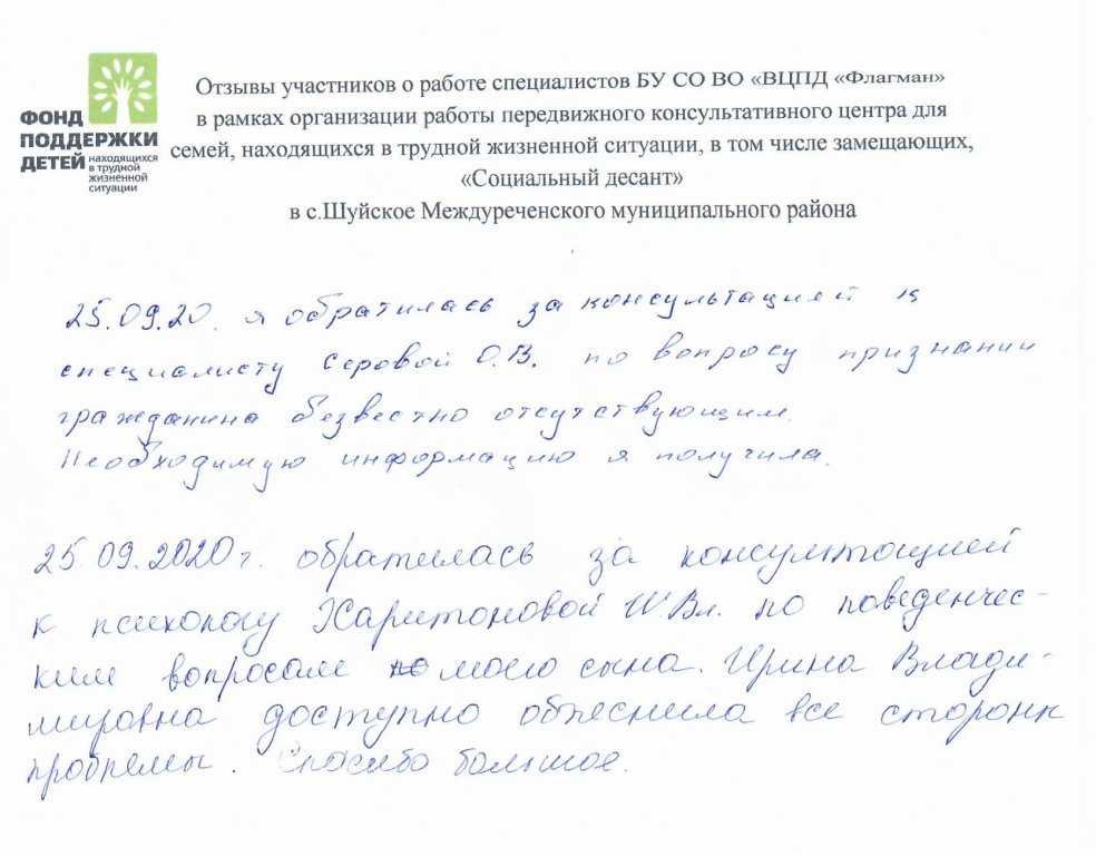 25 сентября 2020 года специалисты центра "Флагман" выезжали в с. Шуйское, Междуреченского муниципального района в рамках передвижного консультативного пункта "Социальный десант". Информирование граждан осуществлялось в рамках работы Мобильного офиса, реализуемого по проекту "Семья - каждому ребенку!".