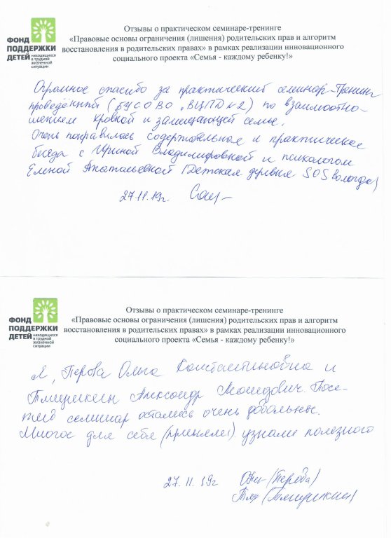 Практический семинар-тренинг «Правовые основы ограничения (лишения) родительских прав и алгоритм восстановления в родительских правах» организован в рамках инновационного социального проекта "Семья - каждому ребенку!" и состоялся 27 ноября 2019 г. Мероприятие имело практическую направленность и вызвало интерес у кровных родителей.