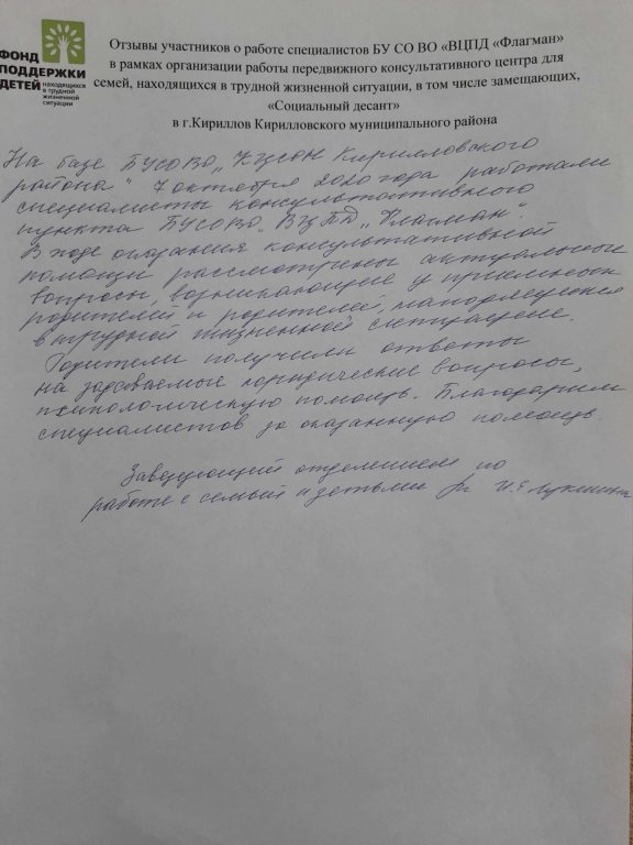 7 октября 2020 года специалисты центра "Флагман" в рамках передвижного пункта "Социальный десант" проконсультировали замещающие и кровные семьи Кирилловского района по актуальным вопросам. Информирование граждан осуществлялось в рамках работы Мобильного офиса, реализуемого по проекту "Семья - каждому ребенку!".